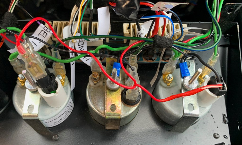 So when we we did the re-wire, we made up a wire loom that connected everything together, so that it worked. Relatively simple; each needed an ignition feed, an earth, and an earth and 12v feed to the instrument light itself. Also the feed from the sensor for the instrument itself, so from the water temperature sensor and the fuel tanks.
